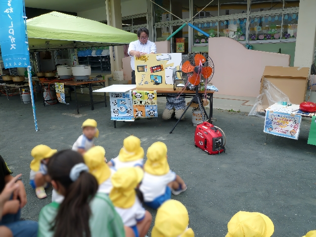 ・当日は、「カレーづくり体験教室」によるLPガスを使った調理や、調理セットを使ったままごと遊び、家庭用エネルギーについて学ぶ紙芝居、LPガス発電機の仕組み学習や発電機で扇風機を回す実験が行われ、園児たちには、消防長会と共同で作成したノベルティーを配布いたしました。