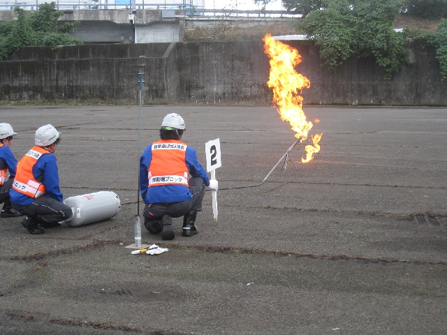 ●「LPガス比較燃焼実験」では、LPガス(20sボンベ)を使用し、LPガスの燃焼遮断実験を行うとともに、LPガスの気体と液体の比較燃焼や、粉末消火器による消化の有効性の確認が行われました。