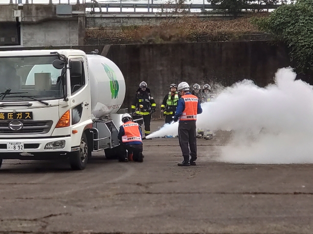 <訓練の開始報告をする御殿場地区会> <比較燃焼実験の様子>●また、「LPガスバルクローリの緊急措置訓練」は、裾野市消防局及び裾野警察署と連携した訓練で、交通事故により、バルクローリの弁箱内の液バルブからガスが漏洩したとの想定で、初期活動や緊急対策協議などの訓練が行われました。