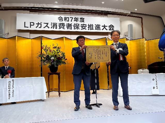 ●令和7年10月23日(木)、都内で経済産業省及びLPガス安全委員会主催の「LPガス消費者保安推進大会」が開催され、当協会員の長田ガス(株)様が、これまで「保安優良液化石油ガス販売事業者表彰」を10回授賞された実績を評価され、経済産業省大臣官房技術総括・保安審議官表彰の「保安優秀液化石油ガス販売事業者表彰」を受賞されました。誠におめでとうございます。