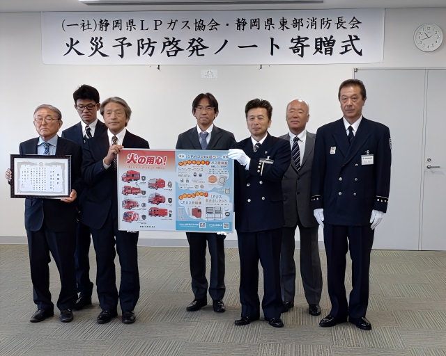 ・令和7年10月7日(火)に、沼津市の駿東伊豆消防本部で消防啓発ノートの寄贈式が行われ、東部支部からは渡邉東部支部長と岡村、杉山、川村、高木各副支部長が出席し、東部地区消防長会からは今井会長ほか1名の皆様にご出席いただきました。